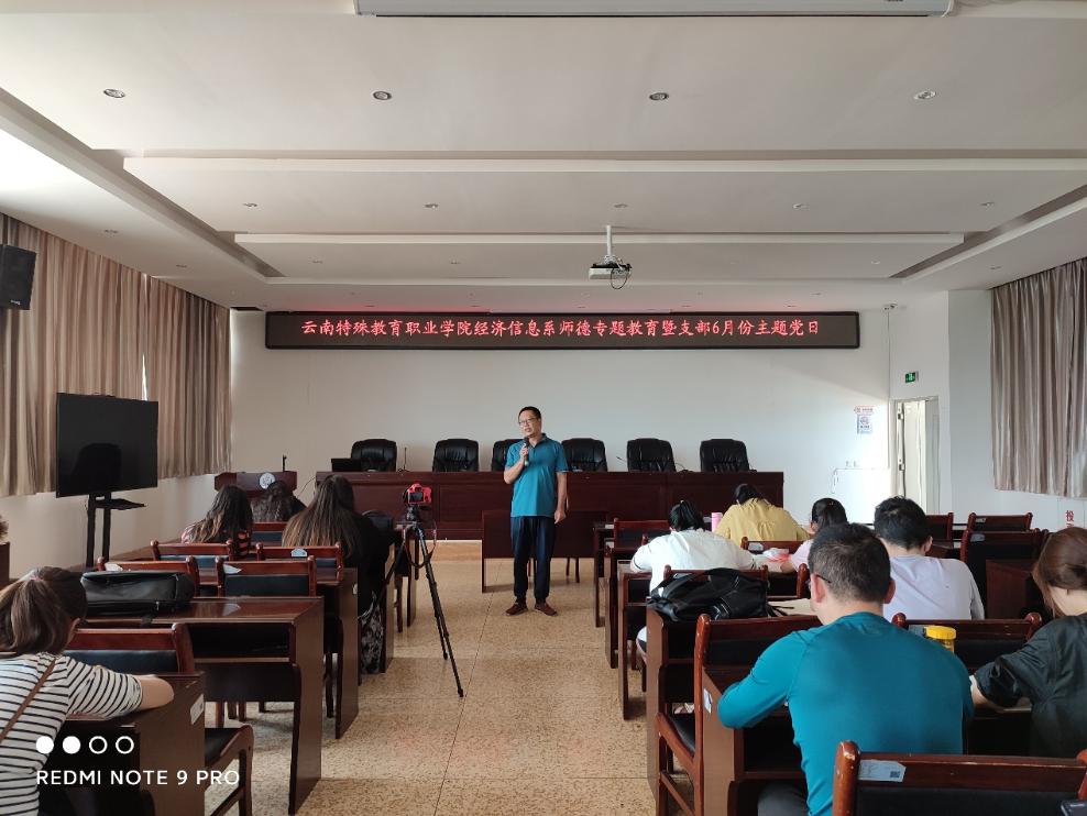 为全面贯彻党的指导方针,强化以党史学习教育为重点的“四史”学习教育,响应学院对教职工爱岗敬业、无私奉献的号召,提高我系教师政治素质和道德水平,调动我系教师教书育人的积极性,提高教学质量。根据《教育部关于在教育系统开展师德专题教育的通知》(教师函【2021】3 号)、《星空游戏app推荐免费师德专题教育工作实施方案》和《经济信息系师德专题教育工作实施方案》,经济信息系6月16日12:40在学院大会议室召开了师德专题教育暨支部6月份主题党日活动,全系教师参加了此次活动。