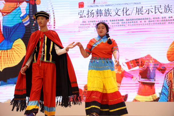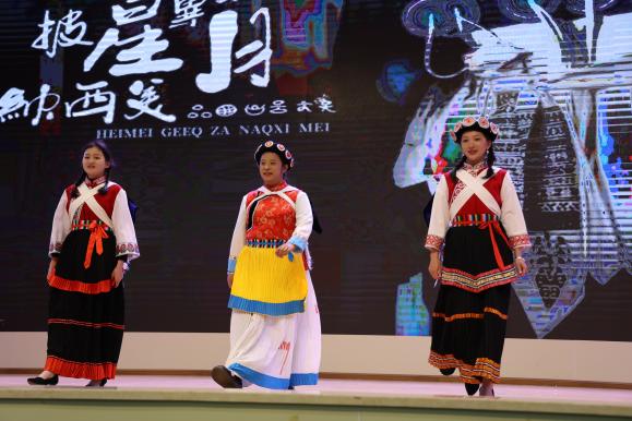 展演在热情似火的开场舞《哈尼宝贝》中拉开序幕,各民族代表身穿艳丽的民族服饰闪亮登场,通过造型、转身等多种形式,将民族传统服饰的质、形、饰、色、画,从不同的角度呈现,让人近距离直观感受,品位不同民族服饰的独特风格和文化内涵。白族的风花雪月,彝族的热情似火,苗族的仙境美,景颇族的热情好客,维吾尔族的异域风情,回族,壮族,佤族,拉祜族,傣族,纳西族,藏族,满族,普米族,蒙古族等。色彩艳丽、婀娜多姿的各民族服饰让人目不暇接。通过同学们的走秀表演,让这些古老而神秘的民族元素,显得更加生动活泼、熠熠生辉。