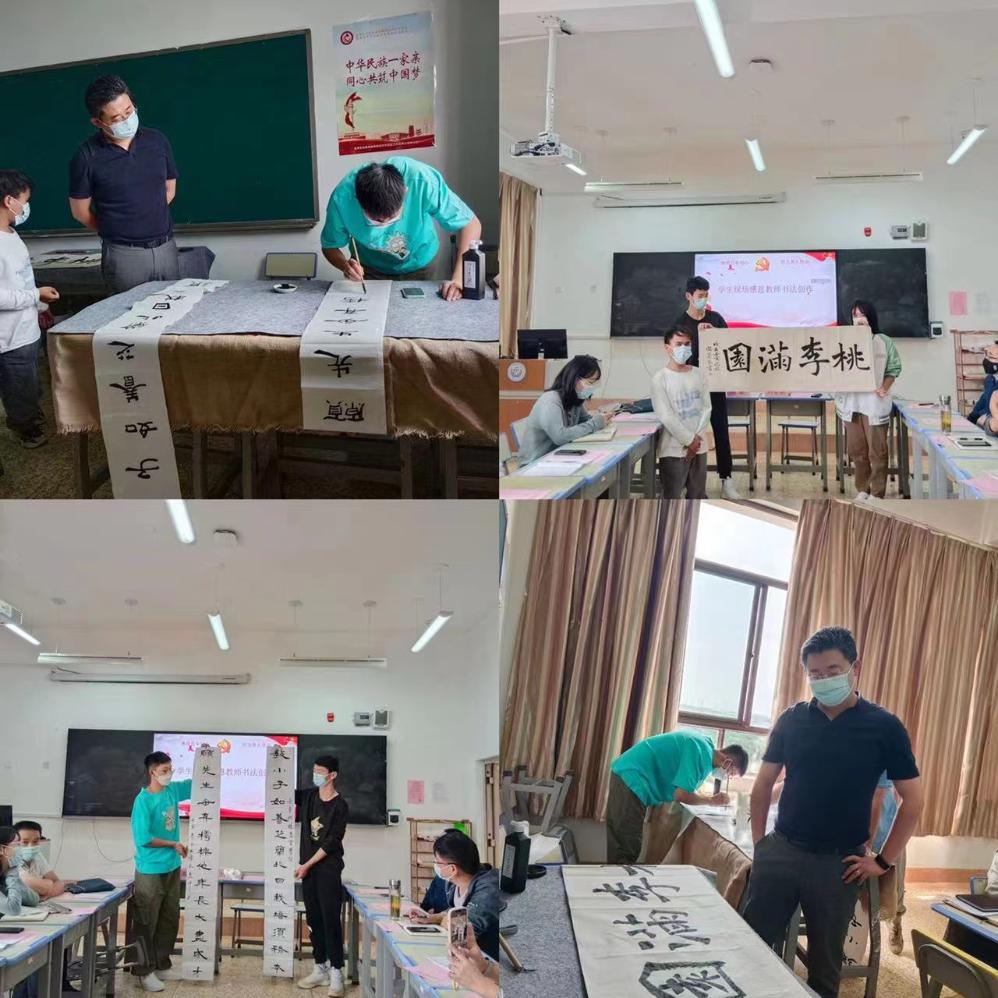一支笔,一卷纸,绘尽诗意,舞出芬芳。经济信息系学生李余成、任安箭两位同学挥毫泼墨,写下“桃李满园”、“教小子如养芝兰此日栽培须务本 愿先生毋弃樗栎他年长大尽成才”表达对老师的赞美之情,他们的书法笔酣墨饱,行笔有力,或重或轻,字里行间流露出了浓浓的感恩之情。