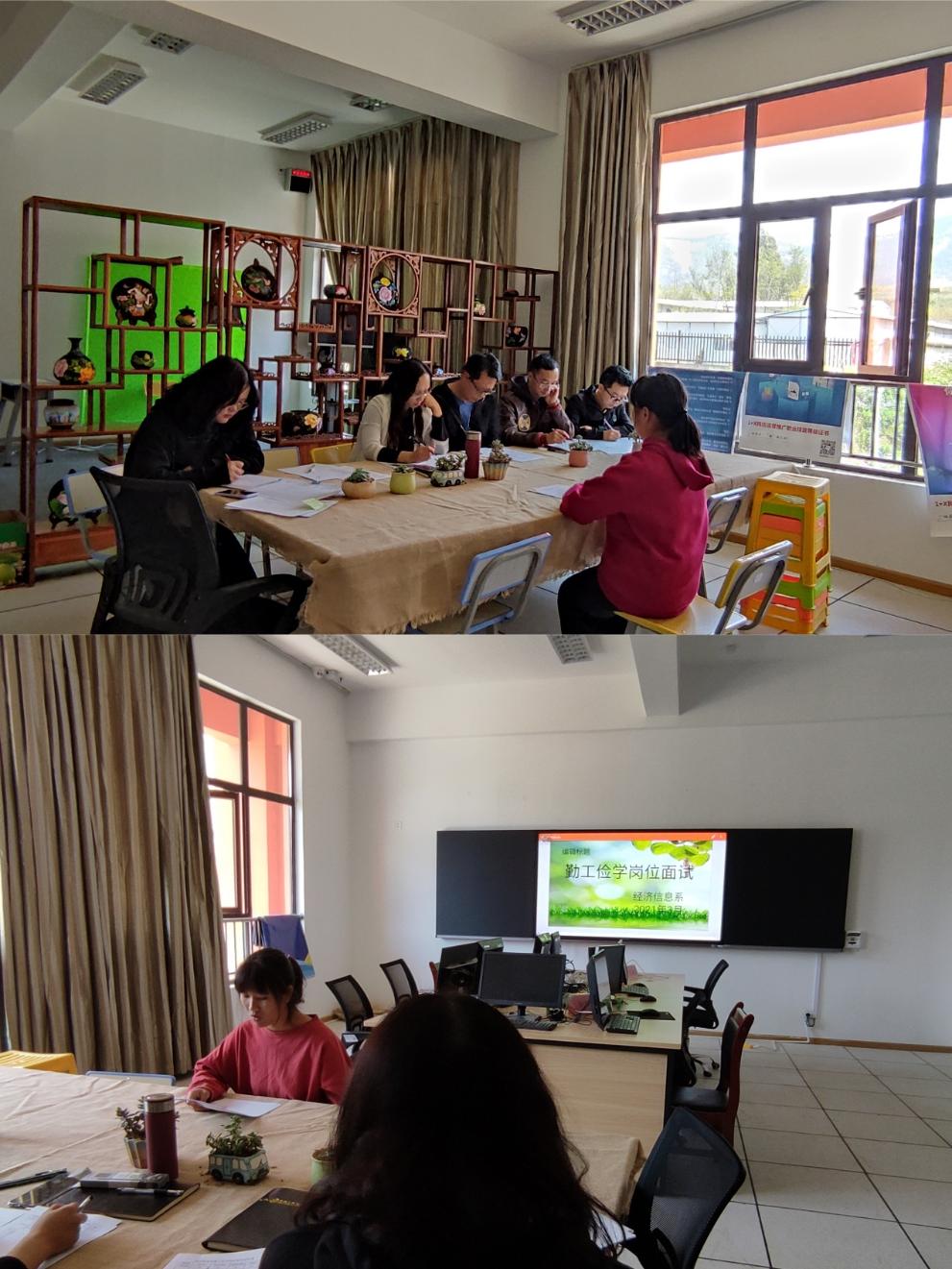 为了让此次面试更加公平公正公开,经济信息系精心组织,科学安排,3月24日中午12:30在实训楼208对学生进行了综合面试。支部书记王小川、系主任高翠、教研室主任孔得志、陈凌霄,辅导员代表陶柯妤、教学秘书王艳娥参加了此次面试工作。实到参加面试的26名同学从自我介绍、为什么来做勤工助学、勤工助学的优势和当勤工助学工作安排与你的学习或其他活动有冲突时怎么办等几个方面进行了综合面试。经过严格的面试筛选,在六位面试官的共同决议下,拟聘朱府虹、张丽萍、刘佳艳、王福禄四位同学为我系勤工助学学生。