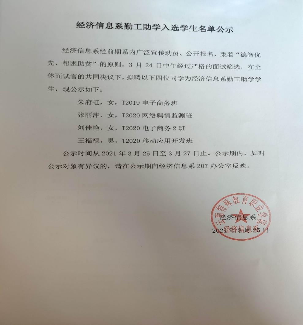 根据学院关于勤工助学的相关通知和要求,为培养锻炼学生自强自立的意志品质,提高学生综合素质以及帮助家庭经济困难学生顺利完成学业。经济信息系按照学校相关要求,经前期系内广泛宣传动员、公开报名,秉着“德智优先,帮困助贫”的原则,共收到勤工助学申请书27份。