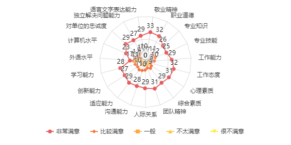 用人单位对我系学生的各项能力满意度达到4.6分(满分5分),用人单位对学生各方面能力满意度最高的前五项分别是敬业精神、职业道德、工作态度、心理素质和适应能力,对在岗学生综合评价较好。