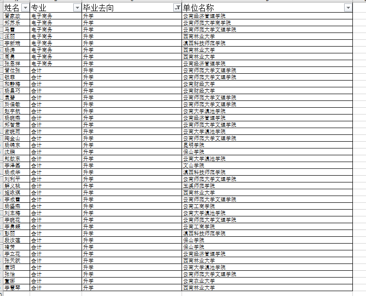 数字经济学院2020届毕业生98人,就业人数97人,就业率99%。其中6人考上党政机关、事业单位;2020届毕业生41人考上专升本,录取本科学校主要有:云南财经大学、西南林业大学、云南农业大学、昆明学院、保山学院、玉溪师范学院、文山学院、滇西科技师范学院、云南大学滇池学院、云南师范大学文理学院、云南经济管理学院、云南工商学院等。