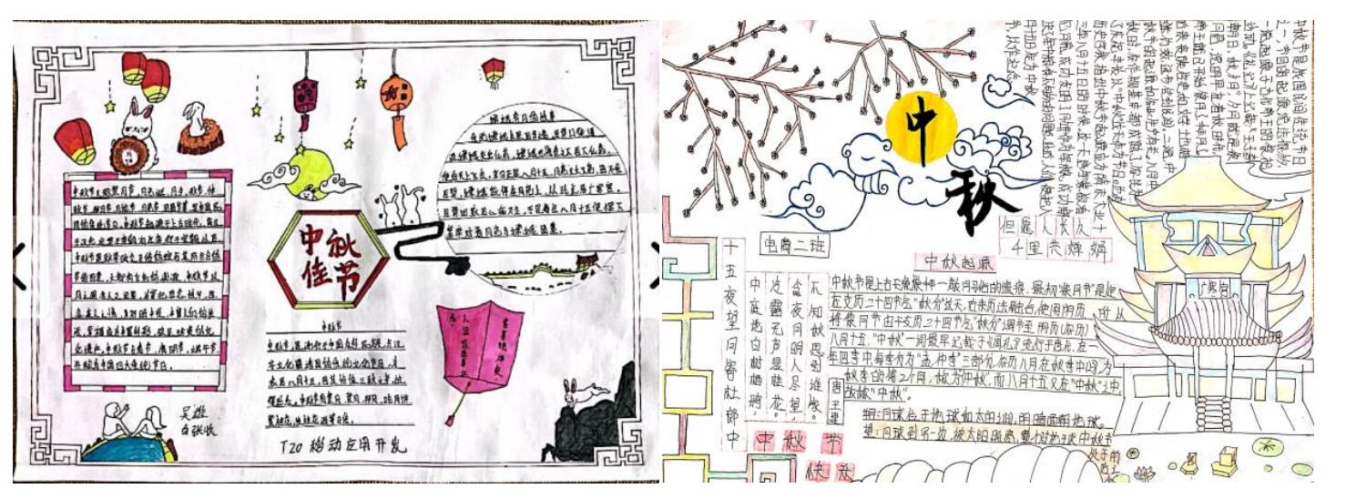 同学们用手中的画笔描绘一幅幅生动鲜明的图片,精选一段段经典的文字诠释了中秋的起源、传说、习俗、寓意。用诗词、歌谣表达了对幸福生活的珍惜,对美好未来的憧憬,对传统节日的热爱。此次活动同学们积极参加,共有51名同学制作手抄报,48位同学参加“三句半”活动。经过同学们在易班线上三天仔细评比的投票,两个活动各评选了最优秀的前三名作品。