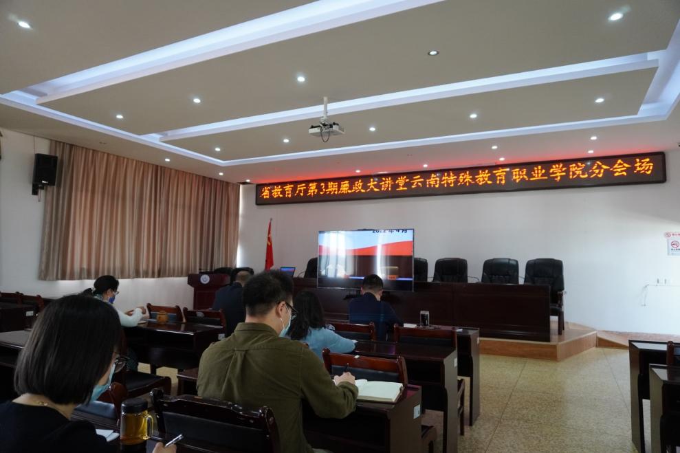 “五四”青年节即将到来之际,省教育厅为深入推进“清廉机关”“清廉校园”的建设,从严从实加强对年轻干部的教育管理监督,形成崇廉尚廉的良好风尚,不断激发干事创业,跨越奋进的精气神,4月29日上午,省教育厅组织开展2022年第3期云南教育廉政大讲堂,我校在诵弦楼大会议室设立分会场,院领导及“80后”科级干部参加会议。
