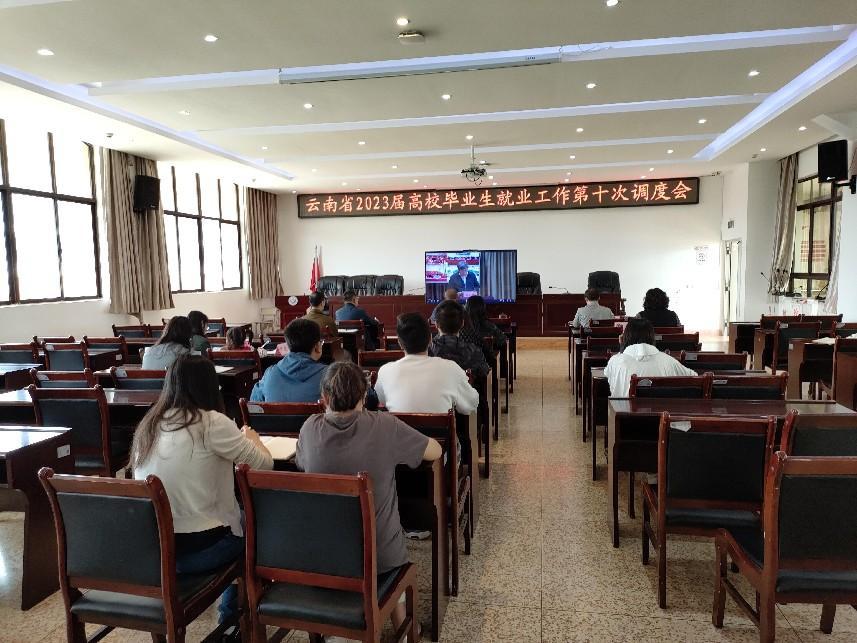 为深入学习贯彻党的二十大精神,落实国务院、教育部和省委、省政府工作部署,传达省政府最新会议精神和教育部就业统计专项核查要求,通报前期工作进展情况,部署安排下步重点工作,省委教育工委、省教育厅组织召开云南省2023届高校毕业生就业工作第十次调度会。我校在诵弦楼6楼大会议室设分会场,党委书记孙继先、院长董亮、副院长李永芳、就业工作负责部门负责人及工作人员、三系书记、三系副书记及工作人员、2023届毕业班辅导员参加此次会议。