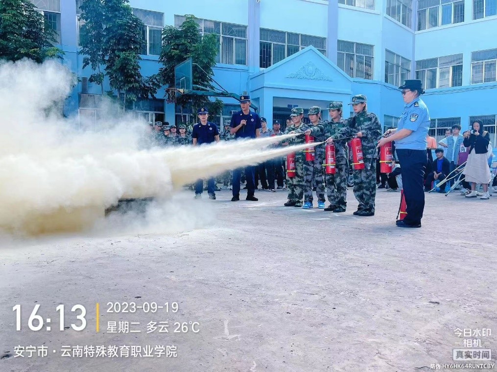 “大家知道灭火器怎么使用吗”?军训场上,消防宣传人员向师生们现场讲解了灭火器的使用方法及注意事项。“灭火器使用步骤‘提、拔、握、压’,灭火时要注意风向,控制灭火距离,对准火焰根部。”消防宣传人员对灭火器操作要点进行演示,并让学生上前体验,通过实操检验学习效果。