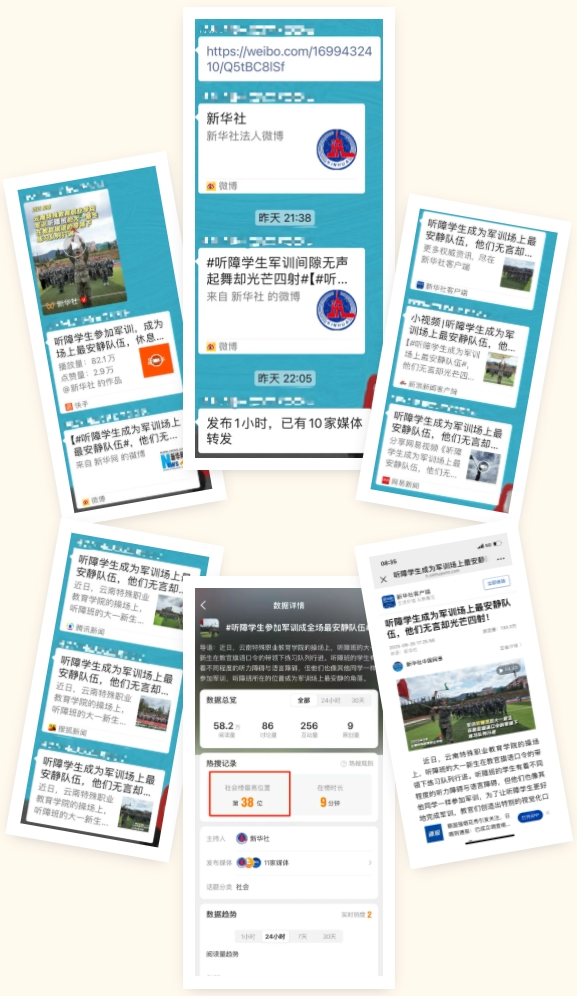 新闻发出后,今日头条、腾讯、新浪、搜狐、网易、快手等十余家媒体纷纷转发。当晚新华社热搜榜一度冲至第38位。截止到21号上午,新华社客户端浏览量突破百万,快手播放量也有82万、获点赞4.7万。我校军训场上“最安静”的训练队伍,备受关注!