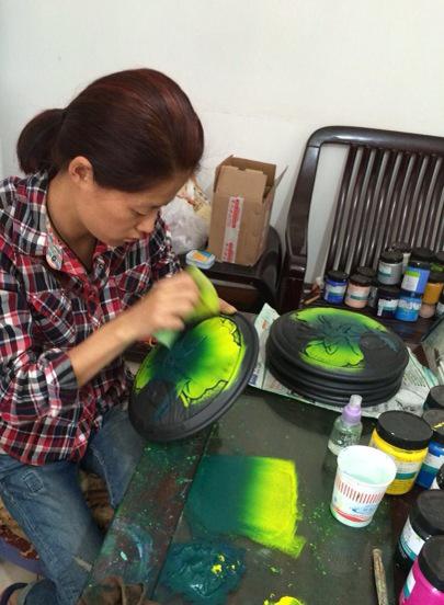 图为实训部人员杨梦如在制作彩绘盘