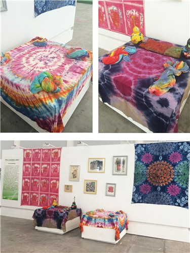 图为职业院校展示区的绘画作品和扎染作品
