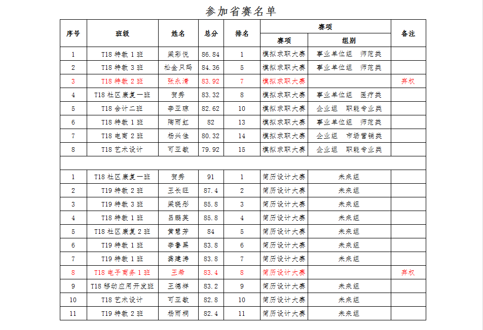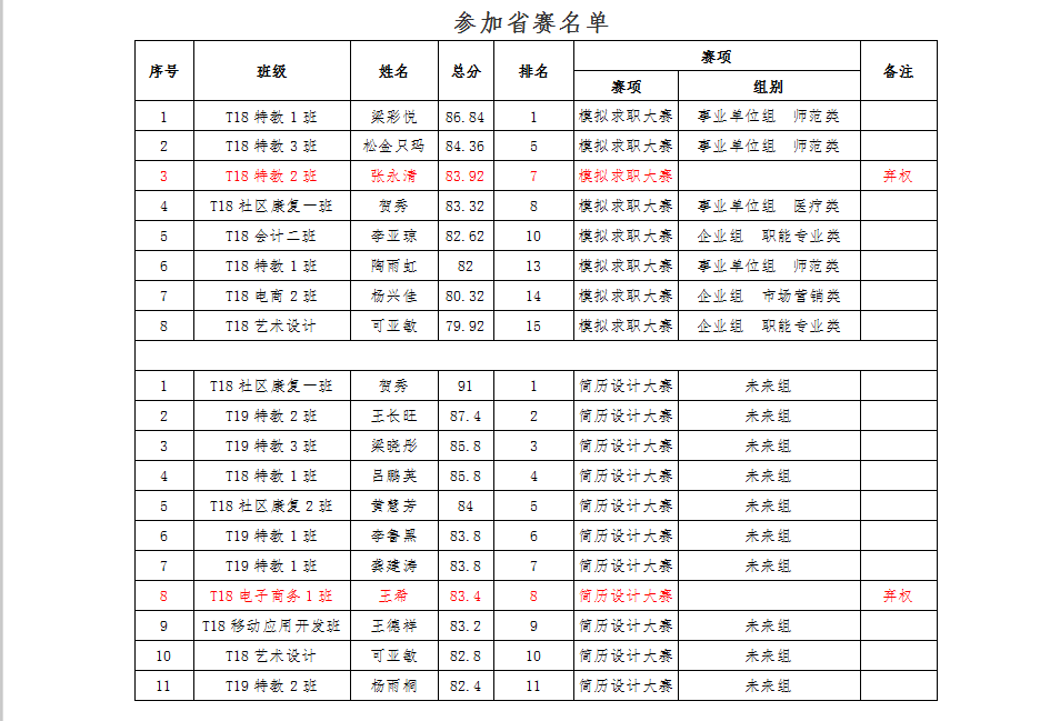 备注:因省赛赛制限制,不允许19级学生参加,故模拟求职大赛按18级学生排名筛选参加省赛名单