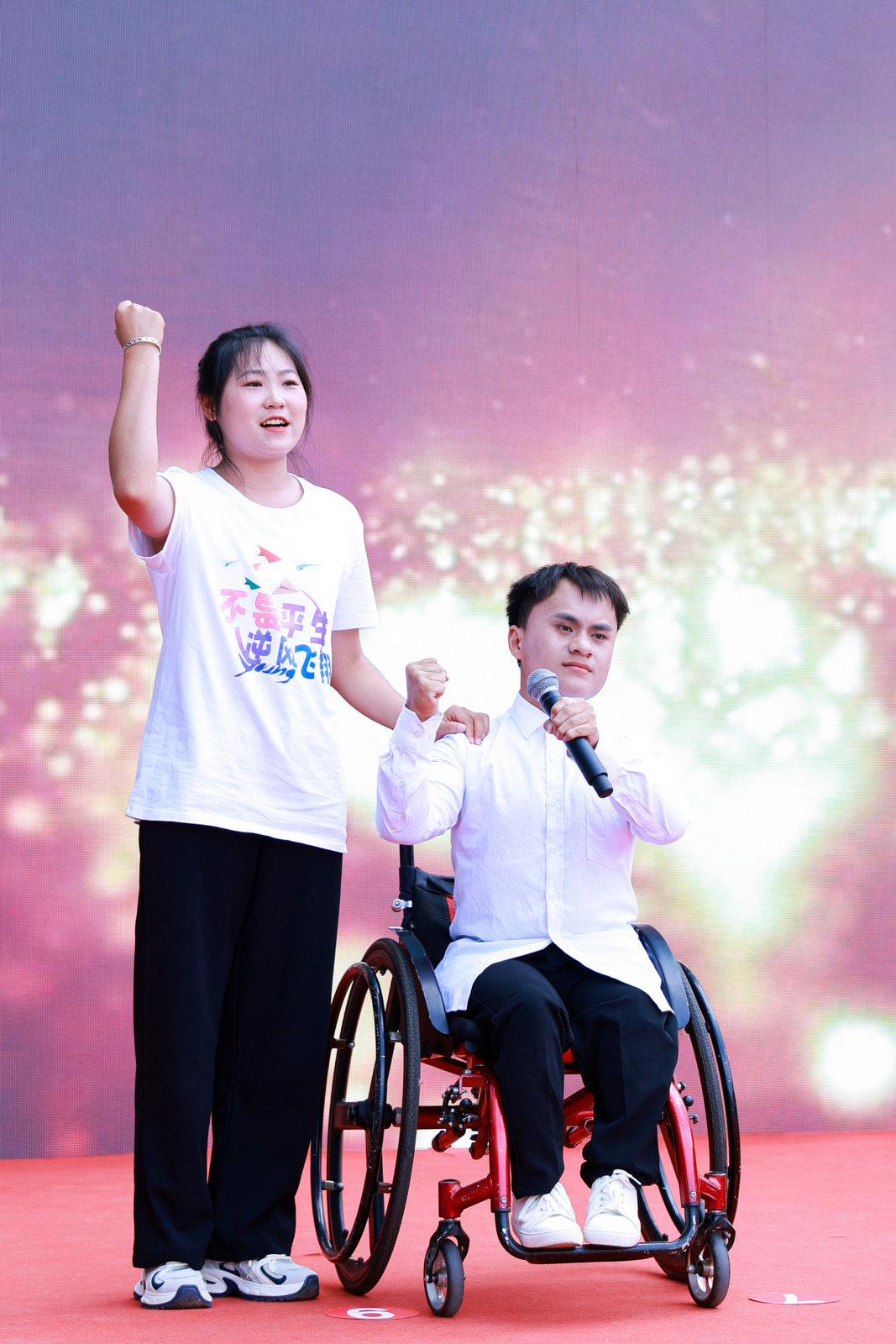 为更好的参与此次演出,我校艺术团教师结合我校美育工作、“一站式”学生社区建设工作、残健融合的理念,精心编排出了朗诵《追光》和歌曲《真的爱你》,演出中,同学们用激情澎湃的朗诵,温柔真挚歌声打动了在场的领导和观众们,赢得了阵阵掌声与好评。
