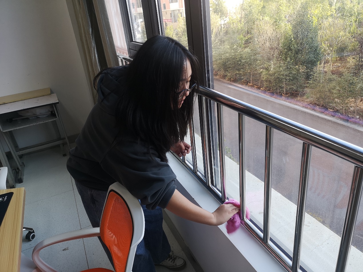 图为学生正在实训楼机房打扫卫生
