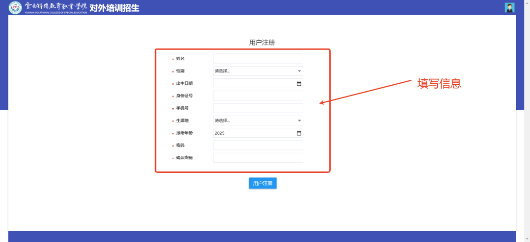 在注册页面,填写姓名、性别、出生日期、身份证号、手机号、生源地、报考年份、密码、确认密码信息,如下图: