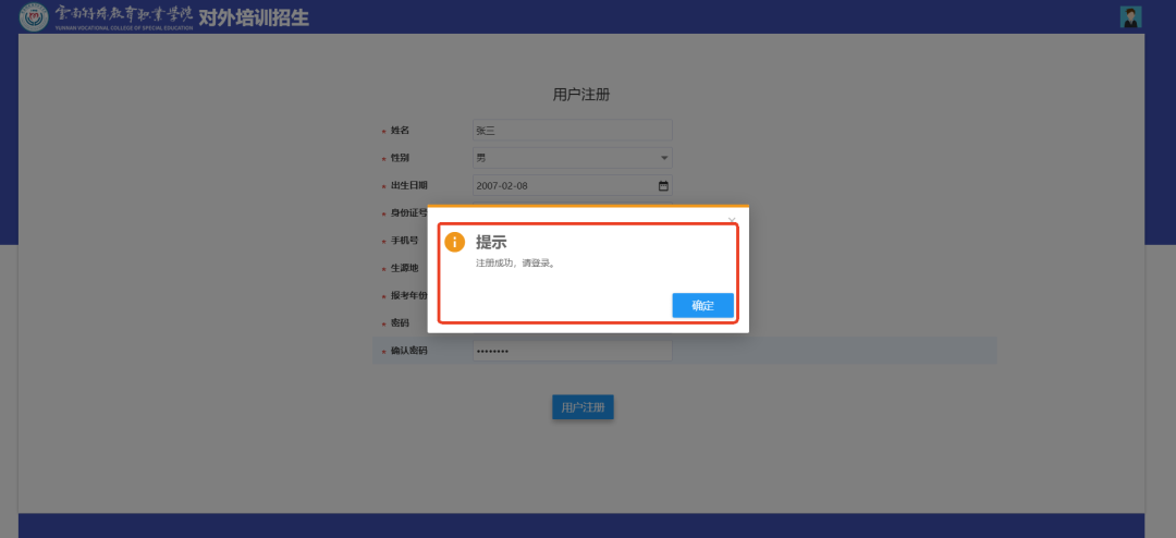 信息完成,检查无误后,点击用户注册,注册用户信息,系统弹出注册成功提示,如下图: