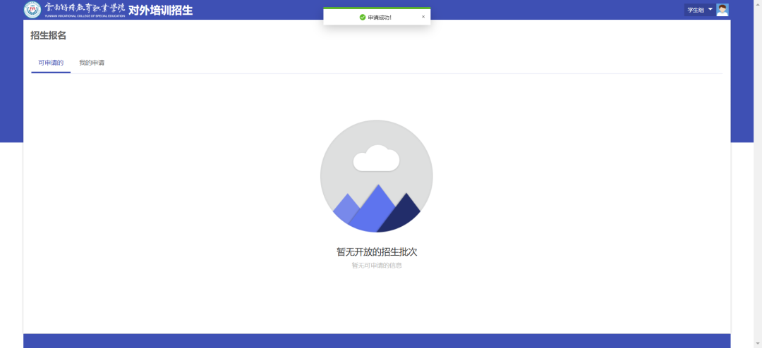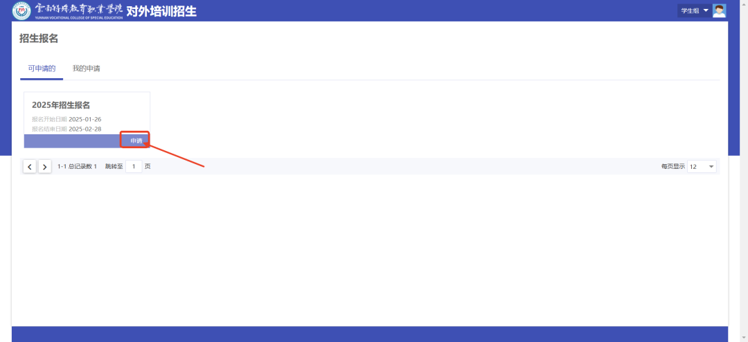 点击“招生工作”,选择招生报名菜单,打开招生报名申请页面,如下图: