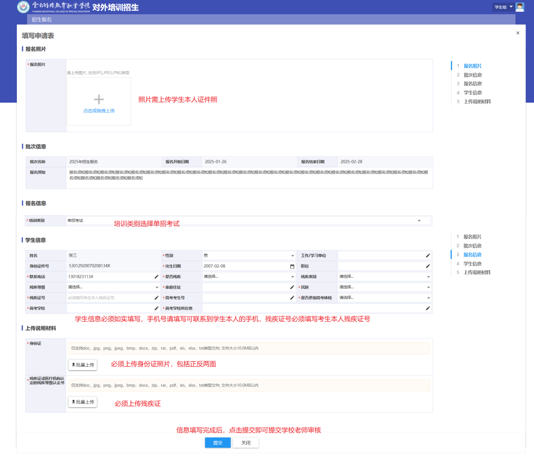 3、学生信息必须如实填写,手机号请填写可联系到学生本人的手机,残疾证号必须填写考生本人残疾证号;