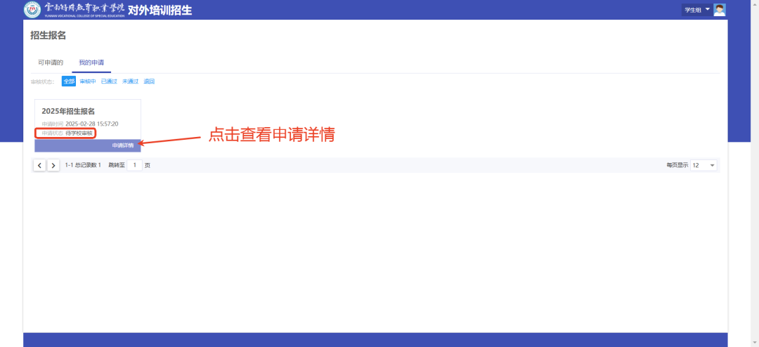 若查询到报名审核状态为“草稿”,则在我的申请中,找到报名信息,点击申请详情,打开详情查看页面: