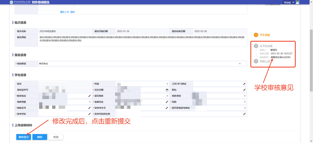在申请页面右侧,可以看到学校审核意见,按照学校审核意见修改信息和材料,点击重新提交,请学校重新对报名信息进行审核。