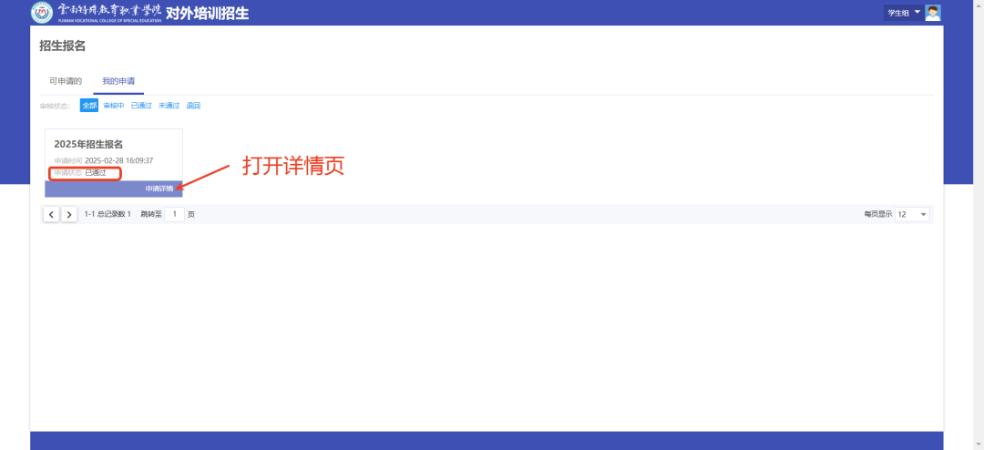 若查询到报名审核状态为“已通过”,则在我的申请中,找到报名信息,点击申请详情,打开详情查看页面: