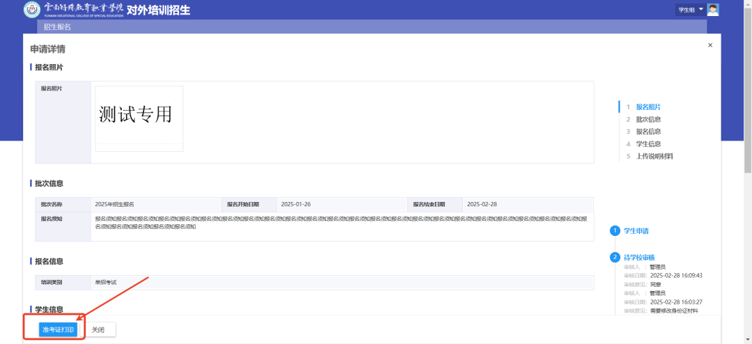 在详情页,点击下方准考证打印按钮,打印准考证;