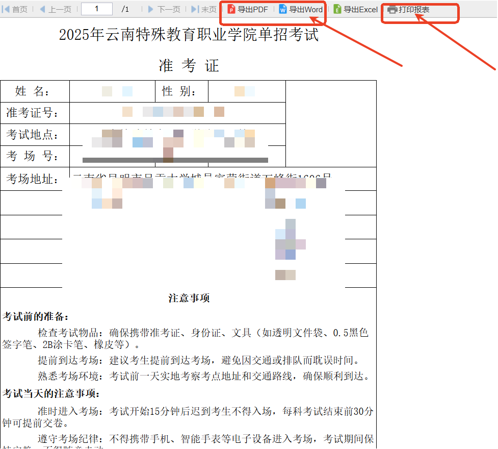 若在打印准考证时间内,则可正常打印准考证;可以导出为pdf或word去打印店打印,也可以点击打印报表链接打印机打印。