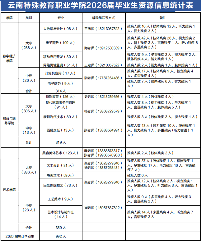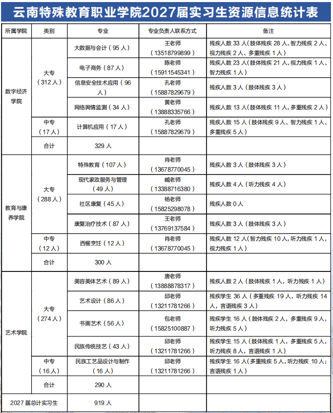 星空游戏app推荐免费于2017年在云南省华夏中等专业学校的基础上组建成立,是我国西南地区唯一一所独立设置的公办专科层次特殊教育职业院校,以培养高素质技能型残疾人和公共服务事业专门人才为主的省属高职院校,隶属于云南省教育厅管理。学院开展全日制中、高等职业教育,兼顾继续教育和短期职业技能培训及鉴定;学院根据产教融合和发展需要,定期组织开展校企联合培养订单专业,以适应区域产业经济发展和社会需要。学院以立足云南,服务西部,面向全国为办学目标定位,坚持“学院—企业—社会”三位一体的人才培养模式,以“残健结合、共同发展、融合教育、服务社会”的办学理念,发挥高职院校资源优势;以市场和就业为导向,紧密结合残疾人就读、就业需求和残疾人事业、公共服务事业的人才需求设置专业;以“立德树人”为根本目标,重视创新创业教育,重视职业能力培养,以产教融合、校企合作为途径,着力培养适应生产、管理、服务一线需要的、自食其力的高素质技能型人才。 尊敬的用人单位: 首先感谢贵单位长期以来对我校毕业生就业创业工作的关心和支持。为全面落实党中央、国务院对高校毕业生等青年就业创业工作的决策部署和教育部、省委教育工委的工作要求,进一步促进我校毕业生高质量充分就业。我校拟定于3月举办“云南省2026届高校残疾人毕业生专场招聘会暨星空游戏app推荐免费“春季促就业攻坚行动”。现将有关事宜函告如下: 一、招聘会时间及地点 报名时间:即日起—2026年3月19日24:00 举办时间:2026年3月25日13:30-18:00 举办地点:星空游戏app推荐免费呈贡校区本部(昆明市呈贡区吴家营万峰街1909号) 二、活动组织 主办单位:中共云南省委教育工委、云南省教育厅 承办单位:云南省大中专毕业生就业服务中心、星空游戏app推荐免费 协办单位:云南云才人力资源咨询有限公司 三、参会单位及人员 1.有招聘需求的用人单位; 2.2026届大、中专(残疾)毕业生和毕业2年内未就业的大、中专生; 3.2027届大、中专在校学生(实习); 4.其他有求职意愿的残疾毕业生。 四、毕业生资源 (一)学生人数和专业情况 我校2026届毕业生共有992人,其中大专930 人,中专62人。 2027届实习生大中专共有919人,其中大专874人,中专45人。 五、招聘活动参与方式 1.参会报名 线下招聘活动采用线上报名,请各参会单位于3月19日24:00前在https://ynzpservice.mikecrm.com/qcL65Tp进行报名。 2.参会准备 (1)各参会单位自行制作宣传海报并携带入校; (2)本次招聘会交通及食宿费用自理; 六、联系人及联系电话 就业创业中心邮箱:yntzyjy@163.com 招聘会校企交流QQ群:217040592 冯老师 18487100751 田老师 15087076476 “云特职就业”微信公众号 星空游戏app推荐免费 就业与创业指导中心 2026年2月9日