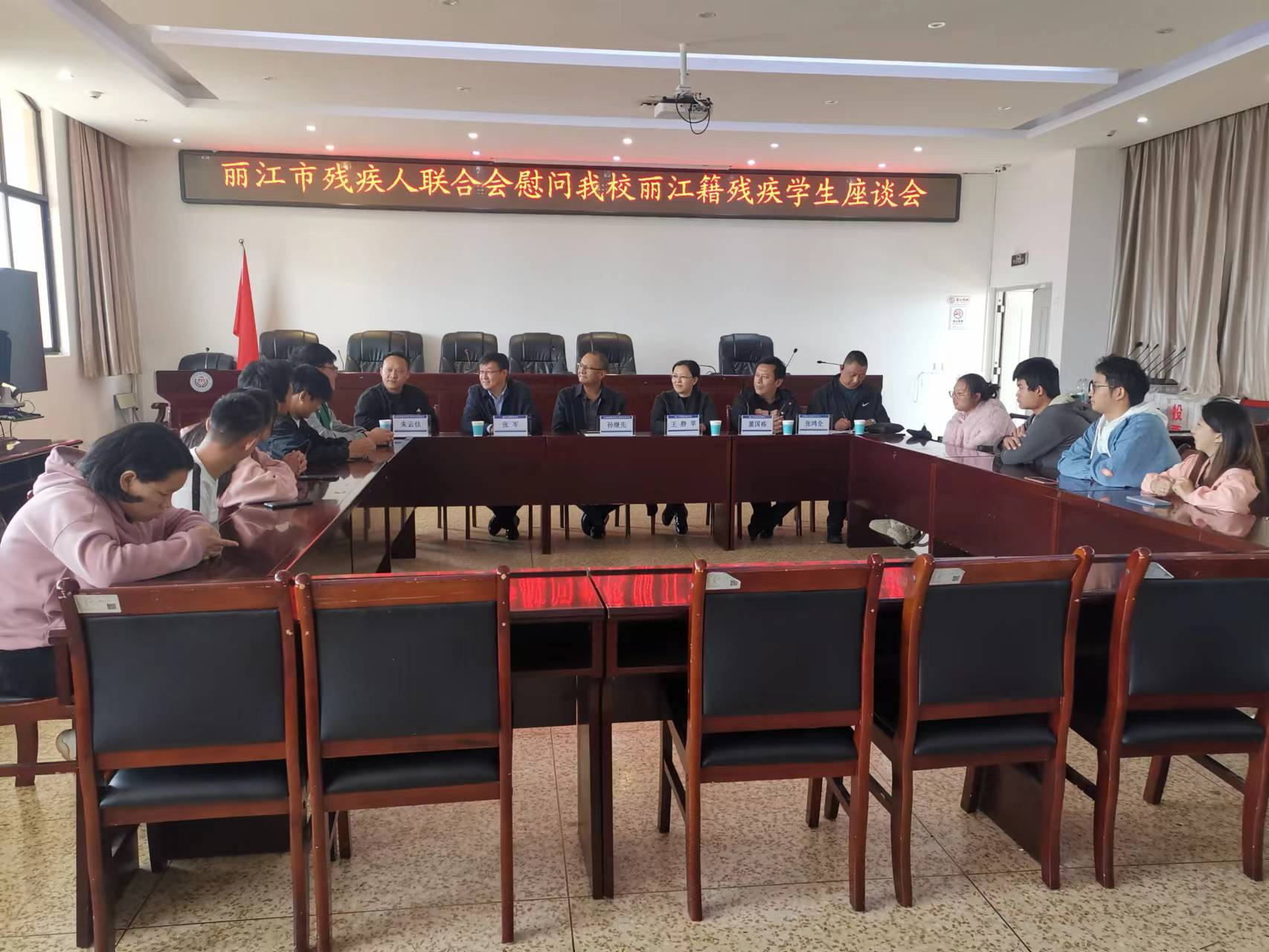 2023年11月13日,丽江市残疾人联合会领导一行4人到我校看望慰问了30名丽江籍残疾学生。学院党委书记孙继先、学生处处长朱云佳同志参加了此次慰问座谈会。会议由学生处处长朱云佳主持。