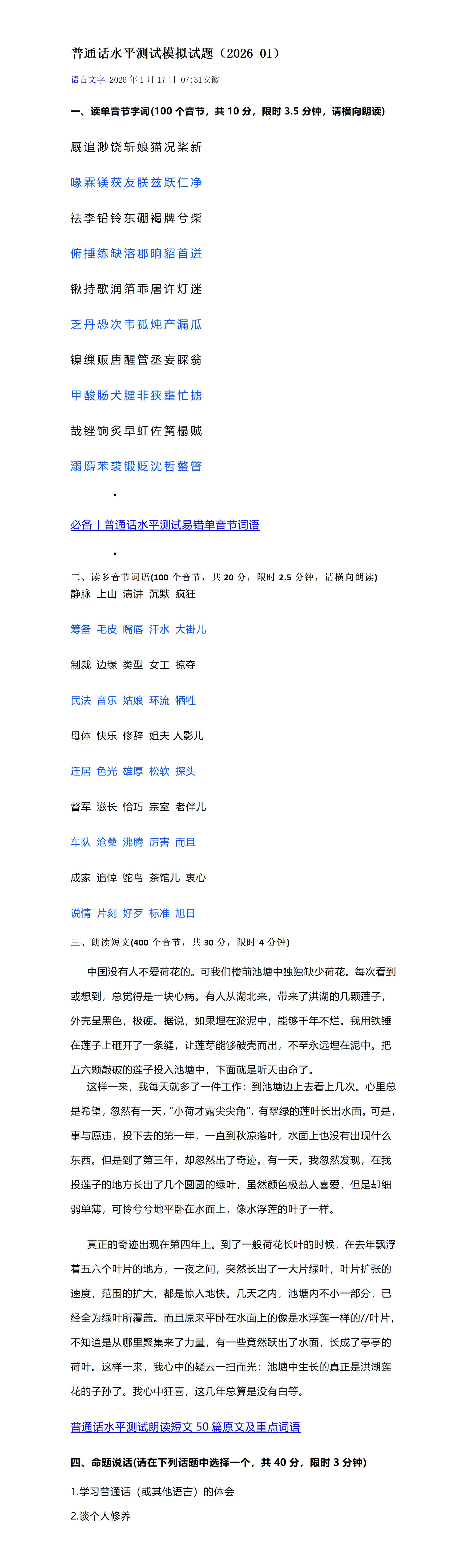 普通话水平测试模拟试题(2026-01)
