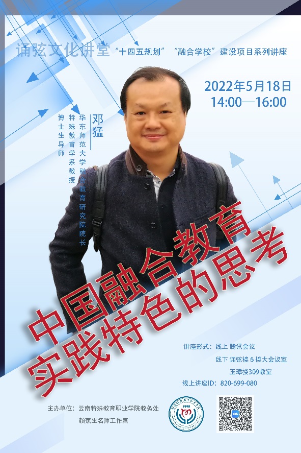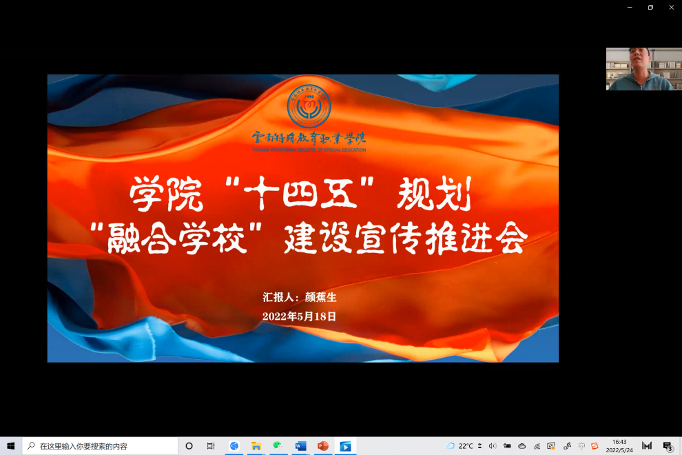 为深入学习领会《云南省“十四五”特殊教育发展提升行动方案》文件精神,贯彻落实《星空游戏app推荐免费关于印发“十四五”发展规划和二〇三五年远景目标纲要的通知》中“融合校园”的建设目标,坚持“残健结合、共同发展、融合教育、服务社会”的办学理念,切实落实“三全育人”,打造“融合发展的文化格局”和一流的校风、教风、学风,持续深入了解特殊教育发展趋势和最新前沿理论,2022年5月18日下午,以主会场及线上分会场的形式,学院教务处与云南省“高层次人才培养计划”教学名师颜蕉生工作室共同举办“中国融合教育实践特色的思考”讲座暨“十四五规划”建设项目“融合学校”宣讲会。
