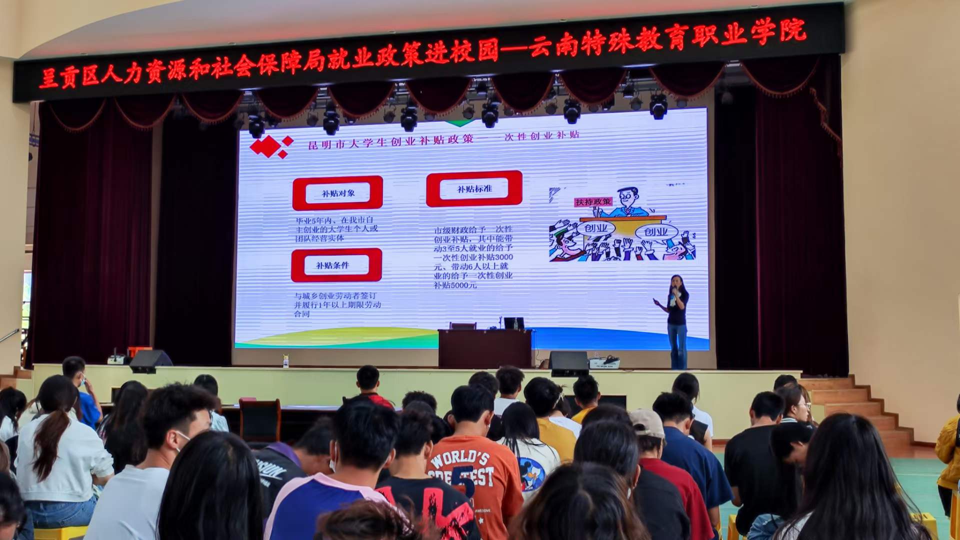 在学校礼堂,呈贡区人社局副局长黄婕向在座的学生详细介绍了高校毕业生就业总体形势,云南省、昆明市重点发展产业和就业创业政策,以及呈贡区鼓励高校毕业生就业创业政策及典型案例。分析了当前毕业生就业创业面临的激烈竞争和有利机遇,鼓励毕业生主动了解政策、用好政策,实现自己的人生目标。