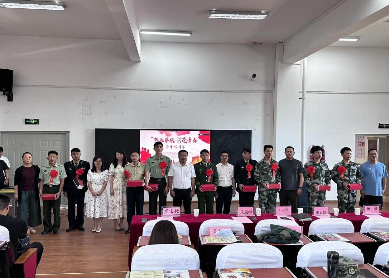 本次动员会在激昂的国歌声中拉开序幕。2022-2023年退役复学学生代表胡方砚、李军、李盛等3名同学依次上台分享参军入伍的心路历程和在部队淬炼成长的经历。随后与会领导现场为9名退役复学学生佩戴红花并颁发纪念品,对2022年度征兵工作中辅导员先进个人进行表彰。
