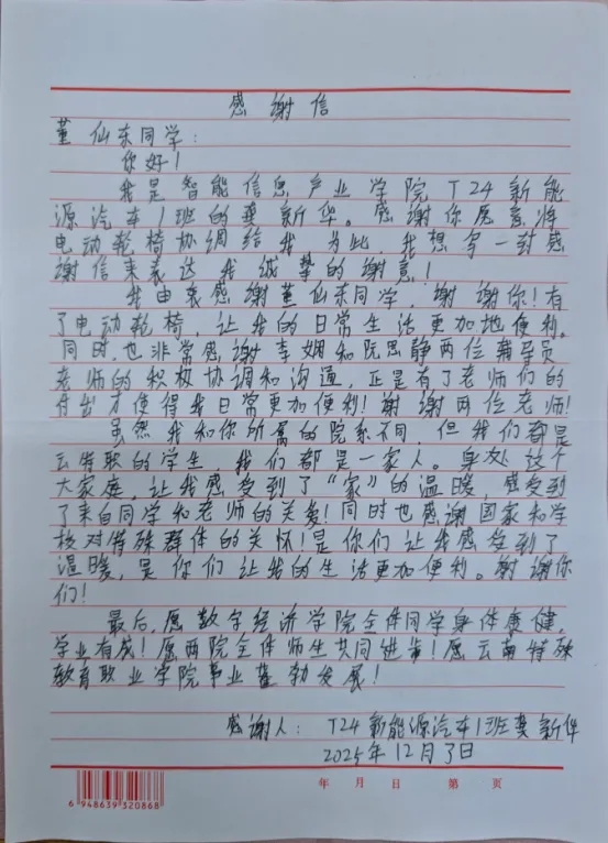在双方辅导员李娴老师和阮思静老师的积极协调下,这把凝聚着学校关怀与董仙东爱心的轮椅,顺利送到了龚新华手中。收到轮椅的那一刻,龚新华激动不已,眼中满是感激。为表达这份沉甸甸的谢意,他特意写下感谢信,字里行间饱含真情:“有了电动轮椅,我的日常生活更加便利。感谢董仙东同学的无私相助,感谢两位辅导员老师的热心协调,更感谢学校这个大家庭的温暖关怀。我们虽属不同院系,但都是一家人。”