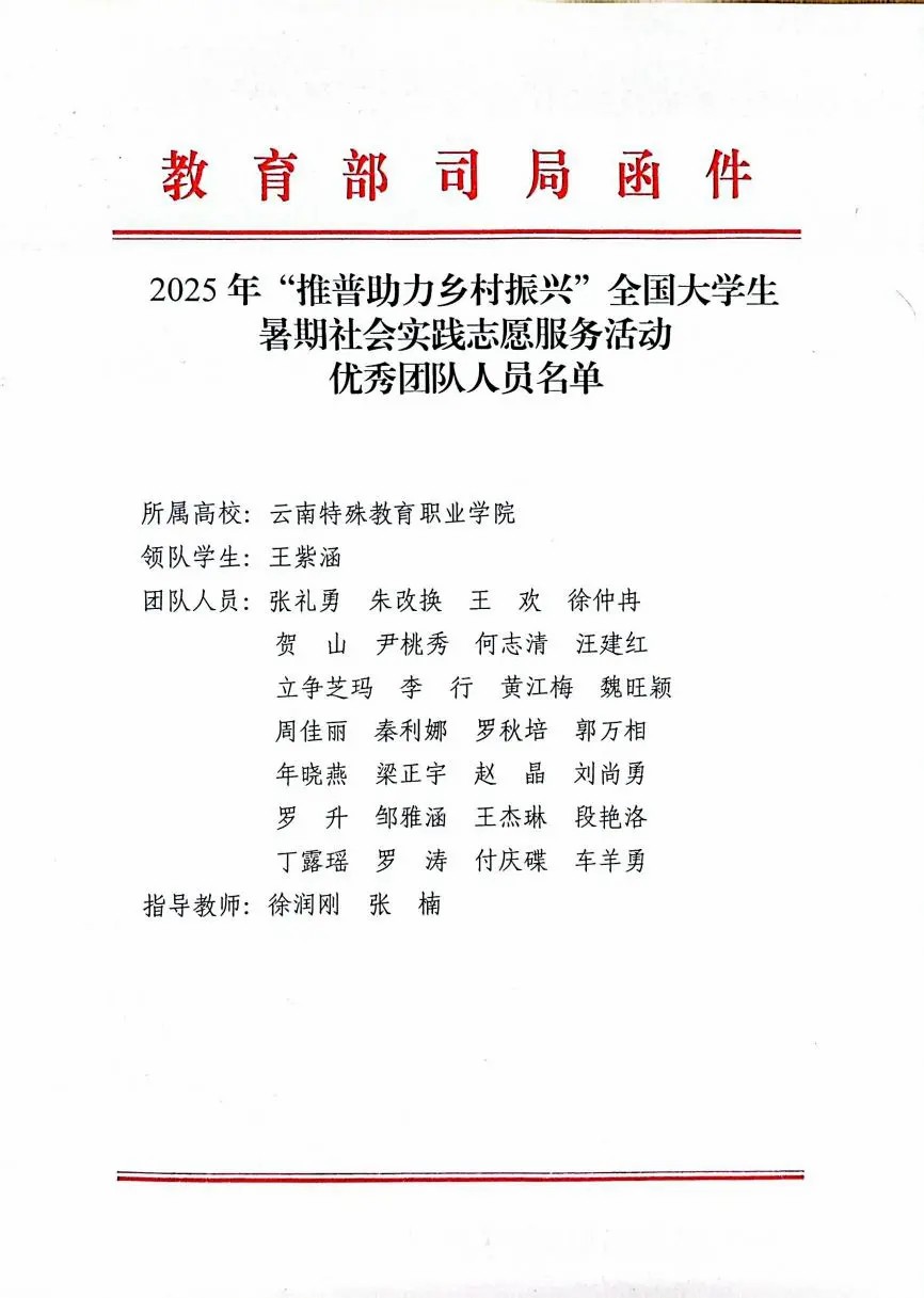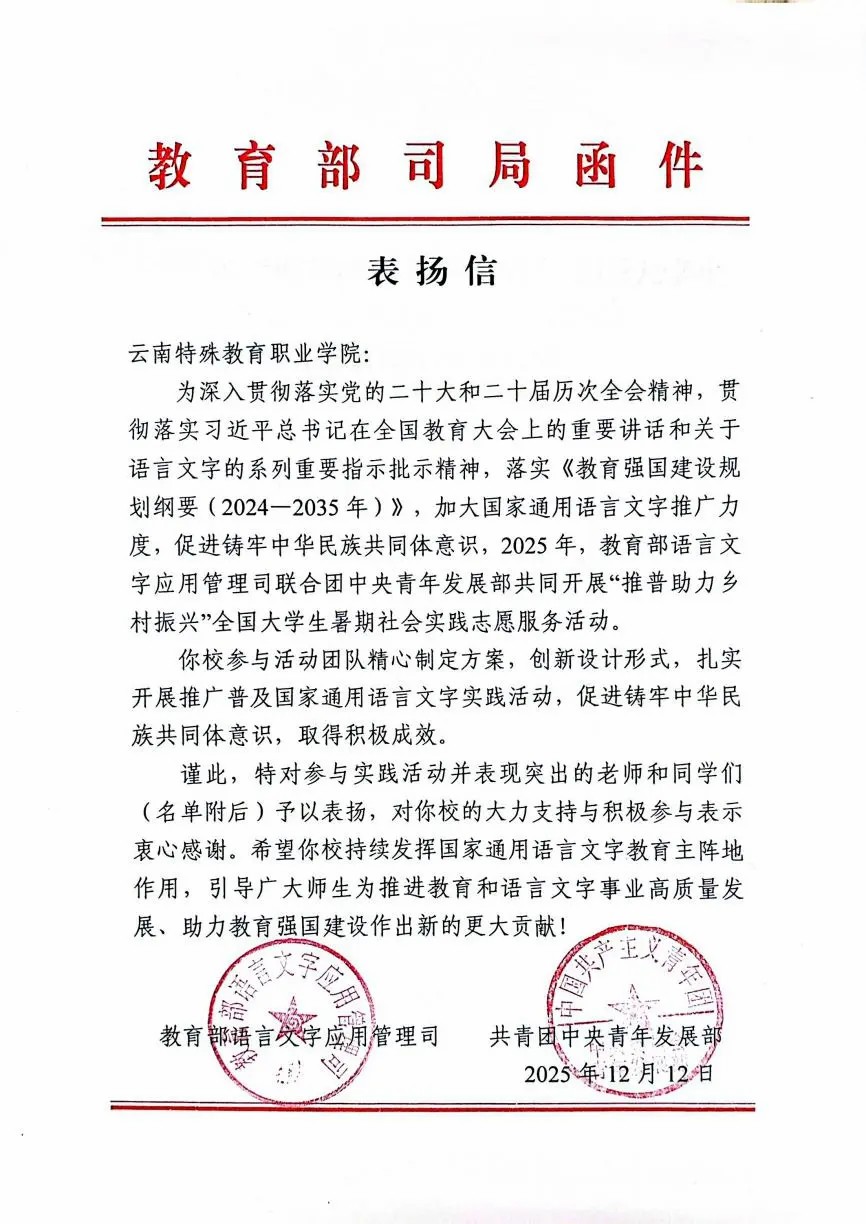 近日,2025年“推普助力乡村振兴”全国大学生暑期社会实践志愿服务活动优秀团队名单正式揭晓!我校艺术学院“无声墙绘志愿服务队”在全国2000支参评团队中脱颖而出,荣获全国“优秀团队”称号,并获得教育部语言文字应用管理司、共青团中央青年发展部联合表扬。