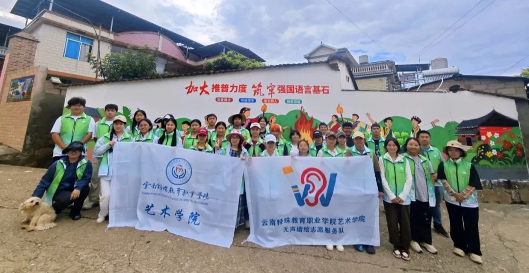 2025年7月,在艺术学院党支部引领和“残健融合,艺路同行”辅导员工作室教师指导下,29名残健学生组成的“无声墙绘志愿服务队”前往云南省禄劝彝族苗族自治县发明村及县特殊教育学校,开展了为期五天的推普社会实践活动。团队以“残健携手”为特色,采取“推普+手语+墙绘”多元方式,精准回应边疆民族地区实际需求,有效探索了“文化共融—民族团结—乡村振兴”协同发展的实践路径。