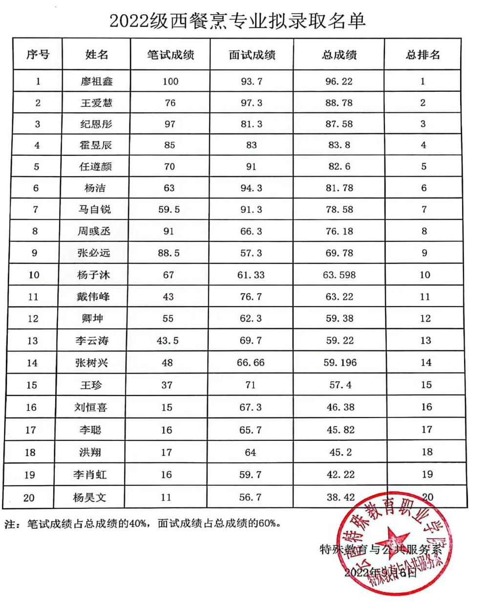 星空游戏app推荐免费2022年西餐烹饪专业计划招生20人,投档学生24人,我院秉着公平、公正、公开的原则,由特殊教育与公共服务系组织22名到校学生分别于2022年8月30日、9月6日进行了入学筛查测试,入学筛查测试包括笔试和面试,根据笔试和面试的综合成绩由高到低录取前20名,现将录取名单公示如下: