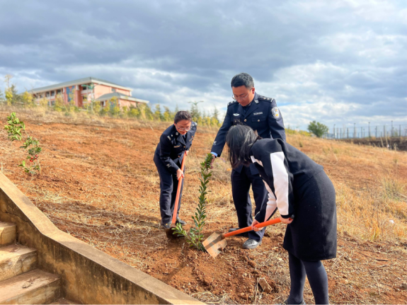 为践行“绿水青山就是金山银山”的环保理念,与会人员共同开展植树活动。大家相互配合,扶苗填土,拿起铁锹、拎起水桶、铲土入坑、培实新土、灌溉浇水;大家精神饱满、干劲十足,一起播种绿色和希望。在大家的辛勤劳作下,一棵棵小树苗“安家落户”。40多棵小树整齐有致、迎风挺立,焕发生机。