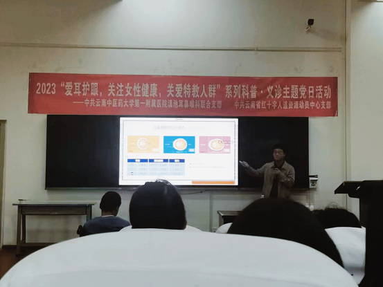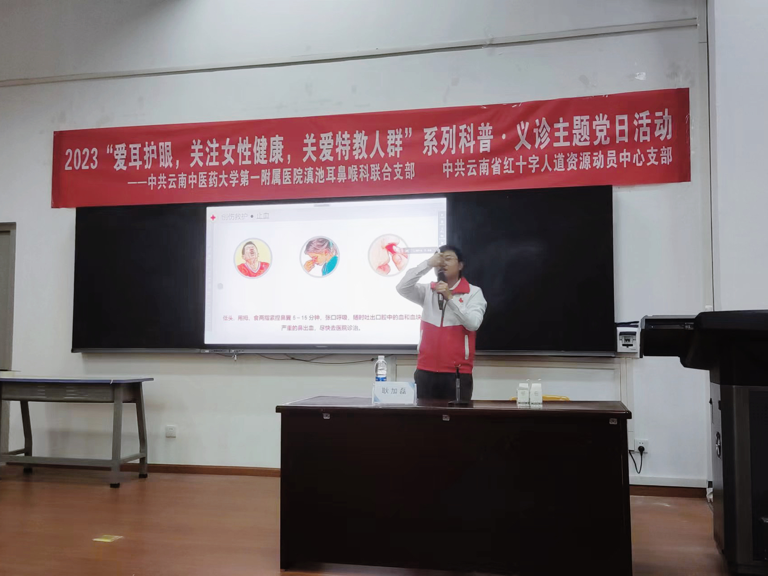 为进一步关爱学生健康,大力弘扬社会主义核心价值观,特殊教育与公共服务系党支部与云南省中医医院滇池耳鼻喉科联合党支部、云南省红十字人道资源动员中心支部、呈贡区红十字会于2023年3月27日联合开展“爱耳日”主题党日活动。