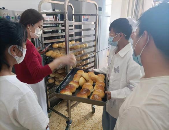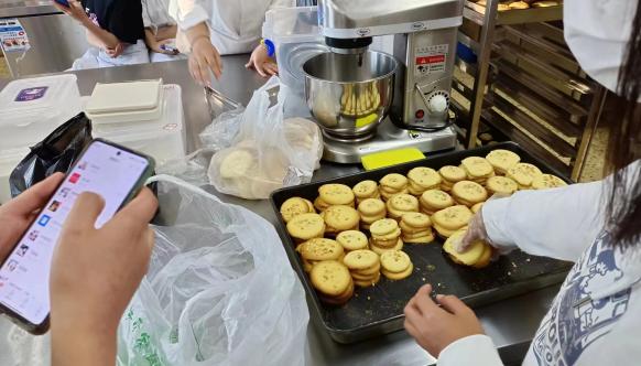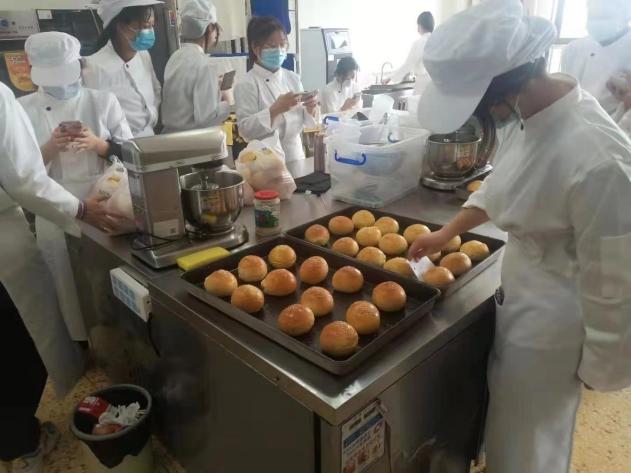 在西餐烹饪专业教师的带领下,不同专业的同学们认真学习手法,了解配比,相继做出了色香味俱全的曲奇饼干、法式泡芙、牛奶餐包、豆沙餐包等各类西点,在做出面点之后,各系学生代表便到制定地点领取新鲜出炉的面点并分发到每位同学手中。