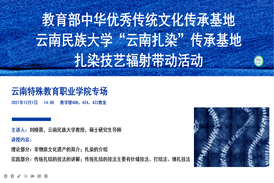 艺术系党支部努力提升支部服务能力,结合系部业务积极推进支部服务范围,11月中旬艺术系党支部收到云南民族大学艺术学院的咨询,需要做一次为植物染料扎染的辐射活动,支部积极推进落实,安排了三个听力言语障碍的大中专班支持本次辐射活动。2021年12月1日,教育部中华优秀传统文化传承基地云南民族大学“云南扎染”传承基地的师生一行12人到校开展宣讲和植染实践,支部全体党员、团总支成员以及部分感兴趣的系部师生前来参与,支部还邀请了行政第一党支部第一党小组成员参与,活动分三个教室同步开展,每个教室均安排了党员教师全程手语翻译,共158人参与。