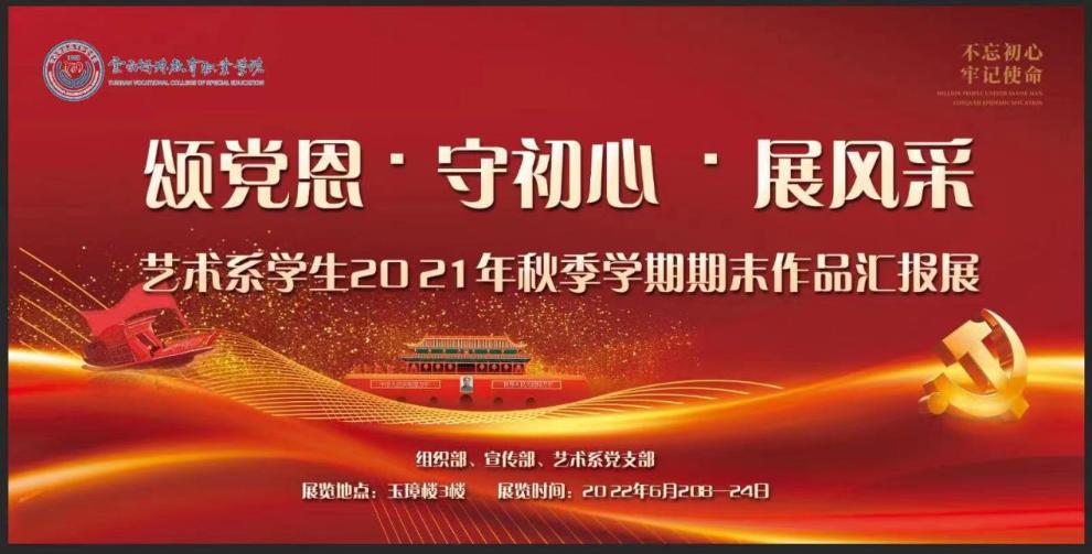 为讴歌党的伟大历史和丰功伟绩,展现党建引领教育教学业务发展的新进展、新经验,艺术系党支部在学院组织部、宣传部的指导和帮助下,集结全系师生力量,以“颂党恩 守初心 展风采”主题,开展了艺术系2021年秋季学期学生期末汇报作品展。本次作品展原计划2021年12月开展,但因疫情防控要求,延期至2022年6月20日-24日在我校玉璋楼3楼展出。