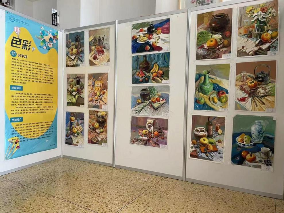 艺术系5个专业26名校内外教师参与了本次作品展,覆盖20、21级大中专全部实操类课程,包含素描、色彩、工笔画、民族纹饰图样、装饰版画、油画、陶艺制作及彩绘、民族剪纸等42门课,共收集和展出作品500余件,其中包含1个党建作品专区和40多件课程融思政成果作品。